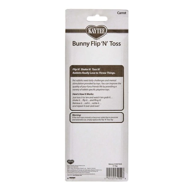Prevent boredom in your bunny buddy with the Kaytee Bunny Flip-B-Toss Carrot Small Pet Toy. This rattle toy for rabbits is shaped like a fun carrot. Your furry friend will have a great time grabbing, shaking, flipping and flinging it whenever he has the chance. This rattle toy is made using natural wood and designed to provide your pal with physical and mental stimulation. It measures six inches long and is paw-fect for your rabbit, guinea pig or other small animal.