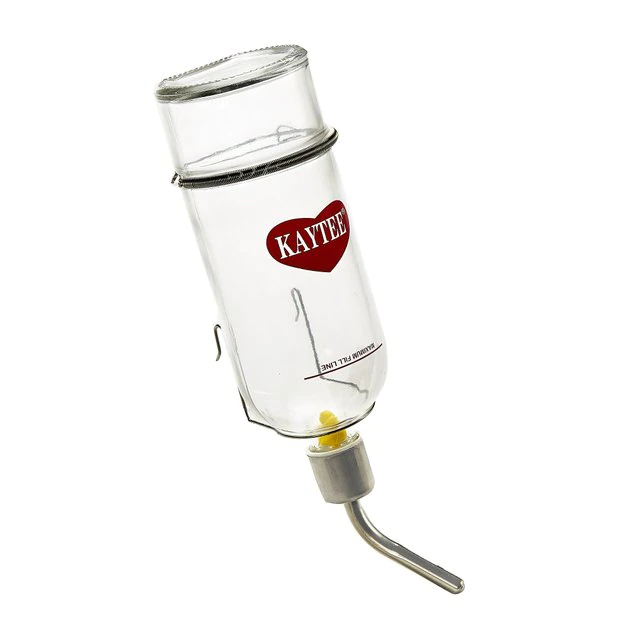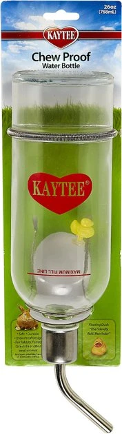 The Kaytee Chew-Proof Small Animal Water Bottle is an extremely durable chew-resistant water bottle for your small animal cage. The main reservoir is made of glass, and the sipper tube and cap are stainless steel. It comes with a spring attachment hanger that securely holds the bottle in place inside or outside any small animal wire home. The Kaytee Chew-Proof water bottle features a double ball bearing sipper tube that makes it drip-resistant and a floating duck that serves as a reminder to refill the water supply.