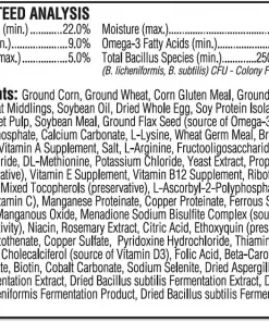 Ground Wheat, Ground Corn, Corn Gluten Meal, Soybean Meal, Soy Oil, Wheat Middlings, Ground Peanuts, Ground Hulled Sunflower, Coconut Oil, Dried Whole Egg, Dried Beet Pulp, Ground Flaxseed, Dicalcium Phosphate, Calcium Carbonate, L-Lysine, Wheat Germ Meal, Brewer’s Dried Yeast, Vitamin A Supplement, Salt Algae Meal (Source of DHA), Fructooligosaccharide, Yeast Extract, Potassium Sulfate, Choline Chloride, Dl-Methionine, L-Arginine, Propionic Acid, (a Preservative), Vitamin E Supplement, Vitamin B12 Supplement, Riboflavin Supplement, Mixed Tocopherols (a Preservative), L-Ascorbyl-2-Polyphosphate (Source of Vitamin C), Manganese Proteinate, Copper Proteinate, Ferrous Sulfate, Zinc Oxide, Manganous Oxide, Menadione Sodium Bisulfite Complex (Source of Vitamin K Activity), Niacin, Rosemary Extract, Citric Acid, Ethoxyquin (a Preservative) Calcium Pantothenate, Copper Sulfate, Pyridoxine Hydrochloride, Thiamine Mononitrate, Cholecalciferol (Source of Vitamin D3), Folic Acid, Beta-Carotene, Calcium Iodate, Biotin, Cobalt Carbonate, Sodium Selenite, Dried A. Oryzaefermentation Extract, Driedbacillus Licheniformisfermentation Product, and Driedbacillus Subtilisfermentation Product.