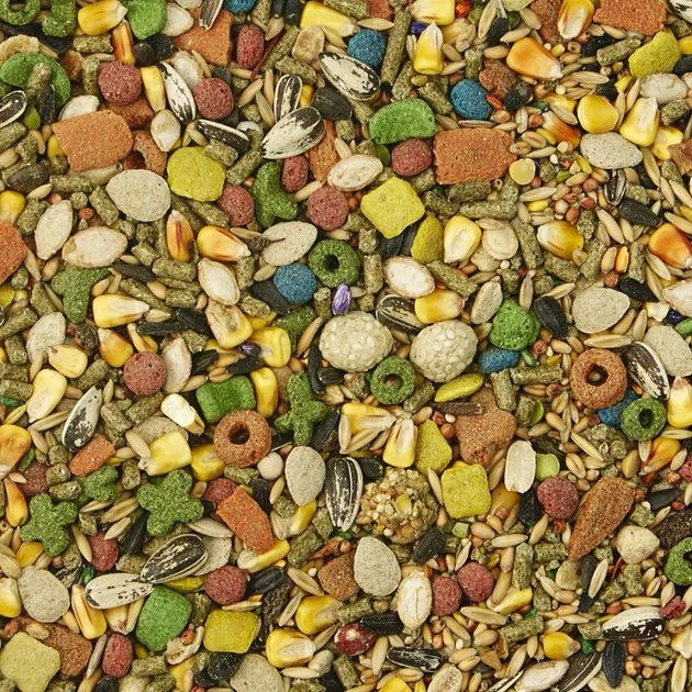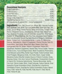Corn, Oats, Wheat, Milo, Sunflower, Millet, Green Split Peas, Oat Groats, Shelled Peanuts, Ground Wheat, Ground Corn, Sun-Cured Alfalfa Meal, Dehulled Soybean Meal, Pumpkin Seed, Barley, Raisins, Dehydrated Carrots, Dried Bananas, Safflower, Canadian Field Peas, Ground Flax Seed, Ground Oats, Dried Papaya, Ground Rice, Dehydrated Sweet Potatoes, Dehydrated Apples, Rice Flour, Dicalcium Phosphate, Calcium Carbonate, Salt, Soy Oil, Algae Meal (Source of Omega-3 DHA), Fructooligosaccharide, Cracked Corn, Hulled Millet, Dried Cane Molasses, Yeast Extract, Sesame Seed, Yucca Schidigera Extract, Vitamin A Supplement, L-Lysine, Dl-Methionine, Choline Chloride, Mixed Tocopherols (a Preservative), Gelatin, Honey, Dextrose, Ferrous Sulfate, Manganous Oxide, Riboflavin Supplement, Zinc Oxide, Vitamin B12 Supplement, Vitamin E Supplement, Niacin, Copper Sulfate, Menadione Sodium Bisulfite Complex (Source of Vitamin K Activity), Rosemary Extract, Citric Acid, Cholecalciferol, Calcium Pantothenate, Pyridoxine Hydrochloride, Thiamine Mononitrate, Calcium Iodate, Biotin, Folic Acid, Dried Bacillus Licheniformis Fermentation Product, Dried Bacillus Subtilis Fermentation Product, Cobalt Carbonate, Sodium Selenite, Artificial Color.
