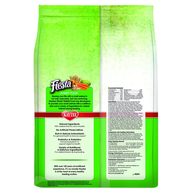 You donโt want to feed your pet just anything, and with Kaytee Fiesta Natural Rabbit Food, you can be sure every small animal in your home is getting optimal nutrition. It offers a nutritional gourmet diet chock-full of fruits, vegetables, seeds, and grains with added prebiotics, probiotics, and antioxidants for digestive health and immune support. There also arenโt any pesky artificial colors or preservatives in this formula, since you want wholesome nutrition that happens to be delicious for your favorite little pet.