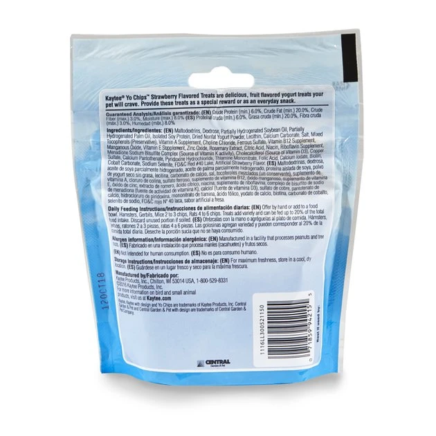 Give your small pet a nutritious, creamy, fruity treat with Kaytee Fiesta Strawberry Flavored Yogurt Chips Small Animal Treats. Treats are a great way to bond with your small pet and add variety to their diet. Kaytee Fiesta Strawberry Flavored Yogurt Chips Small Animal Treats are made of crunchy, fortified chips dipped in a delicious strawberry yogurt coating that will entice even the pickiest of pet palates.