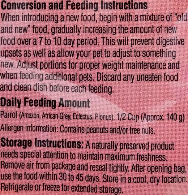 Sunflower, Safflower, Oat Groats, Pumpkin Seed, Ground Corn, Wheat, Corn, Peanuts, Almonds, Raisins, Dried Papaya, Shelled Peanuts, Green Split Peas, Buckwheat, Ground Wheat, Oyster Shell, Milo, Dried Bananas, Corn Gluten Meal, Pinto Beans, White Northern Beans, Ground Flax Seed, Squash Seed, Dried Pineapple, Red Peppers, Red Lentils, Filberts, Pistachios, Dehydrated Carrots, Wheat Flour, Ground Rice, Dehydrated Sweet Potatoes, Rice Flour, Dried Coconut, Dehydrated Apples, Pinenuts, Dehulled Soybean Meal, Wheat Middlings, Sun-Cured Alfalfa Meal, Dicalcium Phosphate, Soy Oil, Calcium Carbonate, Wheat Germ Meal, Dextrose, Ground Oats, Dried Beet Pulp, Dried Whole Egg, Salt, Whole Cell Algae Meal (Source of Omega-3 DHA), Brewers Dried Yeast, Vitamin A Supplement, Choline Chloride, L-Lysine, Fructooligosaccharide, Hulled Millet, Canary Grass Seed, Cracked Corn, Small Yellow Millet, Hulled Sunflower, Dried Cane Molasses, Dl-Methionine, Maltodextrin, Partially Hydrogenated Soybean Oil, Reduced Lactose Whey Powder, Dried Nonfat Yogurt Powder, Vitamin E Supplement, Vitamin B12 Supplement, Spirulina, Yeast Extract, Sesame Seed, Palm Stearate, Riboflavin Supplement, Mixed Tocopherols (a Preservative), Gelatin, Honey, Potassium Sulfate, Ferrous Sulfate, Zinc Oxide, L-Carnitine, Rosemary Extract, Citric Acid, Manganous Oxide, Menadione Sodium Bisulfite Complex (Source of Vitamin K Activity), Niacin, Calcium Pantothenate, Orange Oil, Vanilla, Copper Sulfate, Pyridoxine Hydrochloride, Cholecalciferol (Source of Vitamin D3), Thiamine Mononitrate, Folic Acid, Canthaxanthin, Calcium Iodate, Cobalt Carbonate, Biotin, Dried Bacillus Licheniformis Fermentation Product, Dried Bacillus Subtilis Fermentation Product, Beta-Carotene, Sodium Selenite, Artificial Color.
