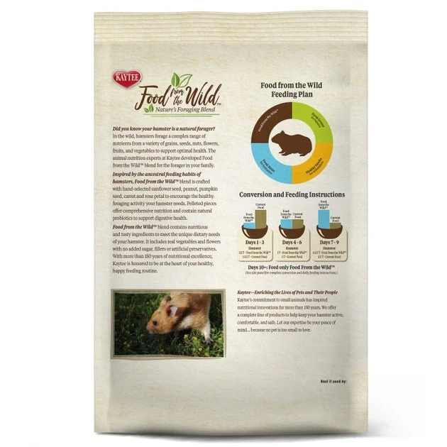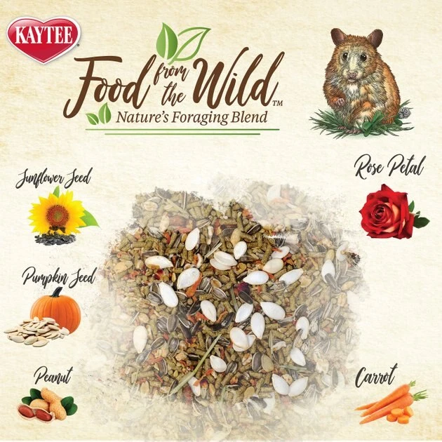 Give your furry friend a meal that matches her natural diet with Kaytee Food From the Wild Hamster Food. It features hand-selected sunflower seeds, peanuts, pumpkin seeds, carrots and roses for a blend inspired by the ancestral feeding habits of hamsters. This pelleted food encourages healthy foraging activity while providing your paw-tner with comprehensive nutrition and natural probiotics to support digestive health. It also contains no added sugar, fillers or artificial preservatives because your companion deserves nothing but the best. Let your hamster enjoy a medley of real fruits, vegetables and flowers with this food from Kaytee.
