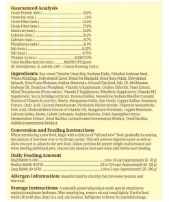 Sun-cured Timothy Grass Hay, Soybean Hulls, Dehulled Soybean Meal, Wheat Middlings, Dehydrated Carrot, Dried Pot Marigold, Dried Rose Petals, Dehydrated Spinach, Dried Cane Molasses, Sodium Bentonite, Ground Flax Seed, Salt, DL-Methionine, Soybean Oil, Dicalcium Phosphate, Vitamin A Supplement, Choline Chloride, Yeast Extract, Mixed Tocopherols (Preservative), Vitamin E Supplement, Riboflavin Supplement, Vitamin B12 Supplement, Yucca Schidigera Extract, Ferrous Sulfate, Menadione Sodium Bisulfate Complex (Source of Vitamin K activity), Niacin, Manganous Oxide, Zinc Oxide, Copper Sulfate, Rosemary Extract, Citric Acid, Calcium Pantothenate, Pyridoxine Hydrochloride, Thiamine Mononitrate, Folic Acid, Cholecalciferol (Source of Vitamin D3), Maganese Proteinate, Copper Proteinate, Calcium Iodate, Biotin, Cobalt Carbonate, Sodium Selenite, Dried Aspergillus Oryzae Fermentation Extract, Dried Bacillus Licheniformis Fermentation Product, Dried Bacillus Subtillis Fermentation Product.