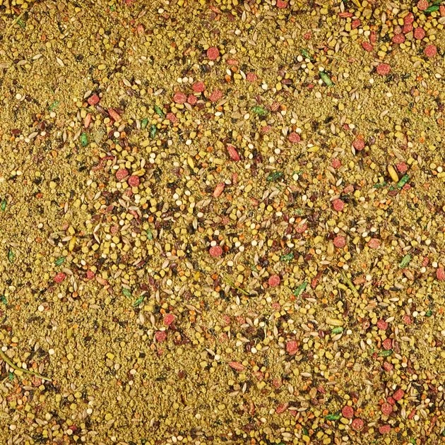 Dehulled Soybean Meal, Ground Corn, Oat Groats, Canary Grass Seed, Corn Gluten Meal, Niger Seed, Flax Seed, Rape Seed, Red Millet, White Millet, Ground Kibbled Corn, Wheat Middlings, Calcium Carbonate, Dried Whole Egg, Sun-Cured Alfalfa Meal, Ground Rice, Ground Wheat, Soy Oil, Poppy Seed, Molasses, Wheat Germ Meal, Dicalcium Phosphate, Brewer’s Dried Yeast, Salt, Corn Sugar, Dehydrated Carrots, Dehydrated Alfalfa Leaves, Ground Flax Seed, Ground Flaxseed, Vitamin A Supplement, Choline Chloride, Algae Meal (Source of DHA), Fructooligosaccharide, Mixed Tocopherols (a Preservative), Yeast Extract, Ground Marigold Petal, L-Lysine, Dl-Methionine, Vitamin E Supplement, Vitamin B12 Supplement, Orange Oil, Anise Oil, Ferrous Sulfate, Manganous Oxide, Riboflavin Supplement, Zinc Oxide, Menadione Sodium Bisulfite Complex (Source of Vitamin K Activity), Niacin, Rosemary Extract, Citric Acid, Calcium Pantothenate, Thiamine Mononitrate, Copper Sulfate, Cholecalciferol (Source of Vitamin D3), Pyridoxine Hydrochloride, Folic Acid, Dried Bacillus Licheniformis Fermentation Product, Dried Bacillus Subtilis Fermentation Product, Beta-Carotene, Canthaxanthin, Calcium Iodate, Biotin, Cobalt Carbonate, Sodium Selenite, Natural Flavors, and Artificial Color.