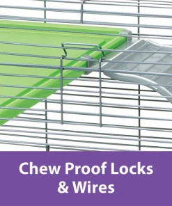 - Chew-proof latches and durable wire for added safety, plus comfort shelves and safety ramps for mobility.