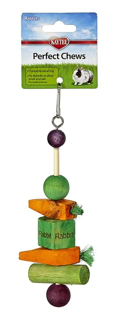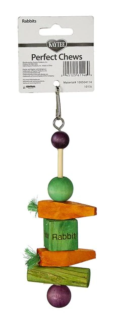 Kaytee Perfect Chews Rabbit Pig Toy is specially designed to fulfill your bunny’s chewing needs. A variety of crunchy textures, colors and shapes — including carrots, wooden balls and a wood block — effectively cleans an trims your pet’s teeth while satisfying her instinctive need to chew and gnaw. A clasp on top of the toy easily and securely attaches to any cage.