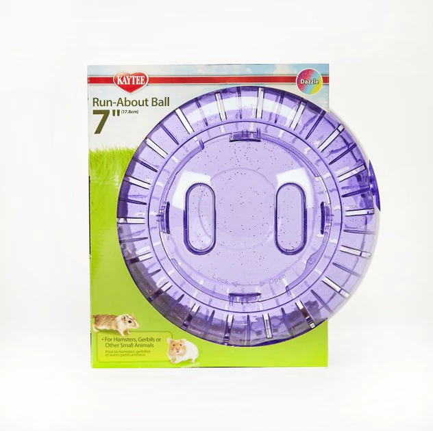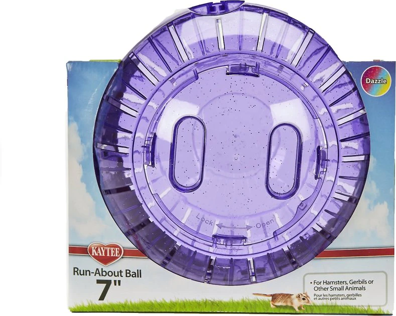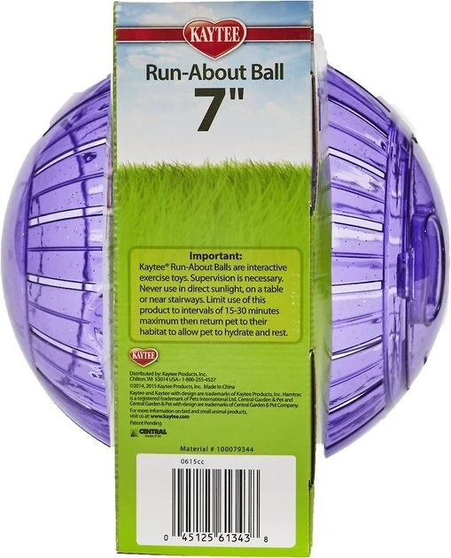 Watch your furry friend explore, roam and race from room to room with the Kaytee-Run About 7โ Small Animal Exercise Ball. The exercise ball provides a great way for you and your pint-sized sidekick to have interactive fun together! Your hamster or gerbil is secured in the ball to allow him to safely relieve excess energy as he curiously travels across the floor. Use the ball as a temporary holding space for when you need to clean your best budโs home.