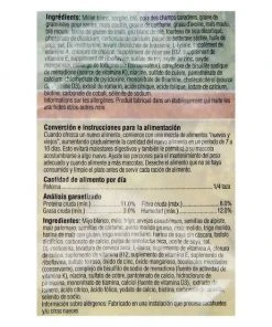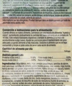 White Millet, Milo, Wheat, Canadian Field Peas, Red Millet, Canary Grass Seed, Popcorn, Safflower, Oat Groats, Ground Yellow Corn, Ground Wheat, Corn Gluten Meal, Wheat Middling, Dehulled Soybean Meal, Dicalcium Phosphate, Calcium Carbonate, Beet Pulp, Soy Oil, Salt, Fish Meal, Dl-Methionine, Brewer’s Dried Yeast, L-Lysine, Choline Chloride, Vitamin B12 Supplement, Vitamin E Supplement, Ferrous Carbonate, Zinc Oxide, Riboflavin Supplement, Manganous Oxide, Menadione Sodium Bisulfite Complex (Source of Vitamin K Activity), Ethoxyquin (a Preservative), Niacin, Calcium Pantothenate, Copper Oxide, Vitamin A Supplement, Cholecalciferol (Source of Vitamin D3), Pyridoxine Hydrochloride, Thiamine Mononitrate, Calcium Iodate, Cobalt Carbonate, Folic Acid, Biotin, and Sodium Selenite.