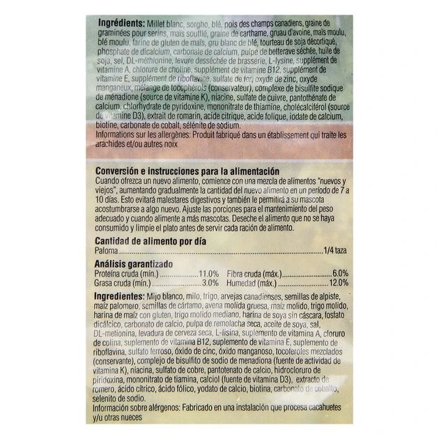 - A clean, wholesome, high-quality mix that consists of natural seeds, pellets and grains such as Canary Grass Seed, Canadian Field Peas, and White Millet