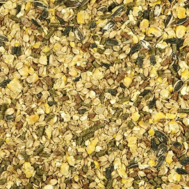 Rolled Corn, Rolled Oat Groats, Rolled Barley, Sunflower, Soybean Meal, Peanuts, Ground Corn, Ground Wheat, Ground Oats, Wheat Middlings, Sun-Cured Alfalfa Meal, Cane Molasses, Calcium Carbonate, Fish Meal, Salt, Brewers Dried Yeast, Lignin Sulfonate, Dicalcium Phosphate, Dl-Methionine, Iron Oxide, Vitamin A Supplement, Choline Chloride, Riboflavin Supplement, Vitamin B12 Supplement, Vitamin E Supplement, Soy Oil, Copper Sulfate, Ferrous Sulfate, Manganous Oxide, Zinc Oxide, Niacin, Menadione Sodium Bisulfite Complex (Source of Vitamin K Activity), Cholecalciferol (Source of Vitamin D3), Calcium Pantothenate, Pyridoxine Hydrochloride, Thiamine Mononitrate, Calcium Iodate, Biotin, Folic Acid, Cobalt Carbonate, Sodium Selenite.